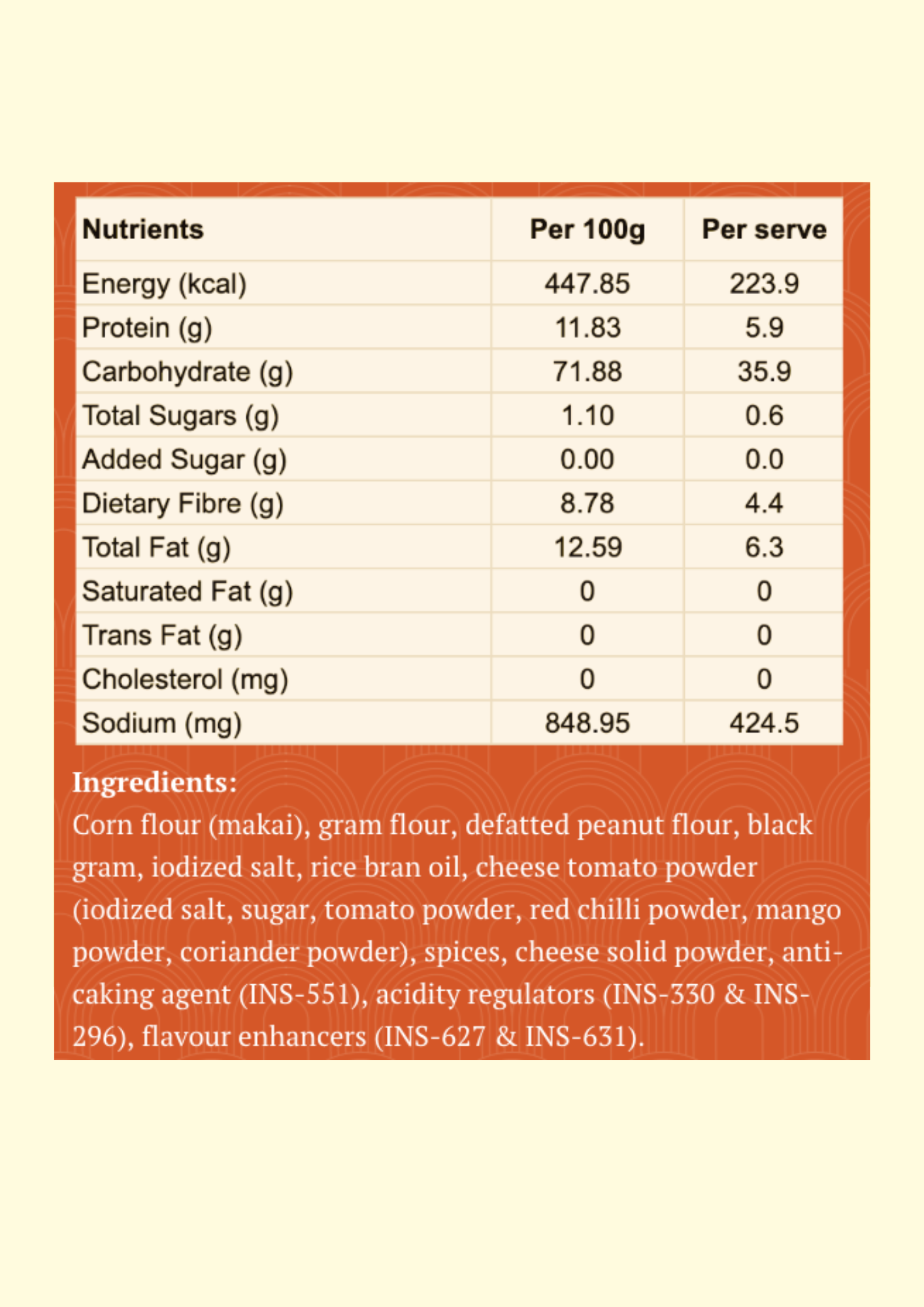 Ingredients: Corn flour (makai), gram flour, defatted peanut flour, black gram, iodized salt, rice bran oil, cheese tomato powder (iodized salt, sugar, tomato powder, red chilli powder, mango powder, coriander powder), spices, cheese solid powder, anti-caking agent (INS-551), acidity regulators (INS-330 & INS-296), flavour enhancers (INS-627 & INS-631).